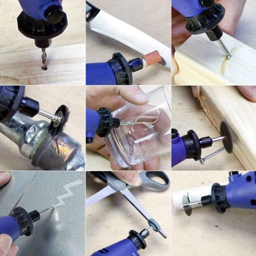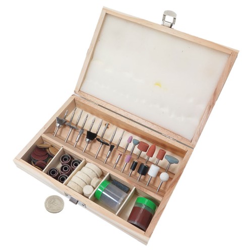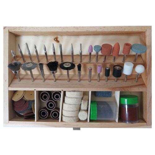 برس های نایلونی شامل 3 عدد به شکل فنجان , مداد و دیسک هستند و 3 برس مسی با همان شکل ها برای کارهای دقیق تر فلزی در دسترس است. شفت های لاستیکی با اندازه های نیم اینچ و یک چهارم اینچ , تیغه اره استیل ضد زنگ 7/8 اینچ و شفت پیچ با قطر سر 5 میلی متر از دیگر تجهیزات مجموعه هستند. مجموعه شامل 9 سر سنگی با اشکال مختلف توپ , استوانه , دیسک و گلوله و 8 سر سنگ الماسه برای انجام کارهای حرفه ای است.