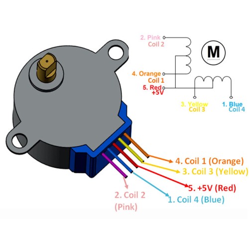 این موتور دارای 5 سیم و 4 قطب است و می تواند به صورت تک قطبی ( Unipolar ) یا دو قطبی ( Bipolar ) راه اندازی شود . در حالت دو قطبی ، سیم مشترک حذف شده و از 4 سیم باقیمانده استفاده می شود . زاویه گام این موتور 5.625 درجه در هر مرحله است و با نرخ تغییر سرعت 1 به 64 عملکرد دقیقی را ارائه می دهد . مقاومت سیم پیج آن 200 اهم 7± درصد در دمای 25 درجه سانتی گراد است و گشتاور در حالت کشش بیش از 34.3 میلی نیوتن متر در فرکانس 120 هرتز می باشد . همچنین گشتاور خود موقعیت دهی آن نیز بیش از 34.3 میلی نیوتن متر است .