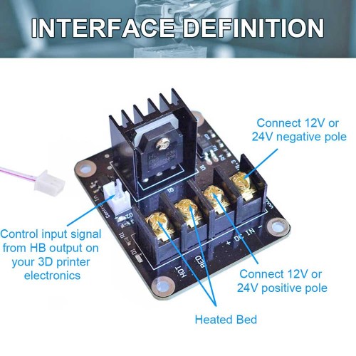 نصب ماژول شامل اتصال سیم های اصلی هیت بد به ماژول ماسفت و تطابق صحیح قطب ها است. پس از نصب ، چراغ آبی روشن میشود که نشاندهنده فعال شدن هیت بد توسط برد کنترلر است. این ماژول عملکرد پایدار ، محافظت کامل برد و افزایش قدرت پرینتر سه بعدی را تضمین میکند و انتخابی ایده آل برای کاربران حرفه ای و علاقه مند به پرینت با کیفیت بالا میباشد.