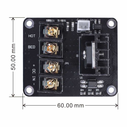 ابعاد این ماژول 60x50 میلی متر و وزن خالص آن 25 گرم است. با استفاده از این ماژول، جریان بالای 15 آمپر مادربرد تا 25 آمپر افزایش مییابد و هیت بدهای 12 ولت و 24 ولت به راحتی پشتیبانی میشوند. ماژول ارتقاء قدرت و کنترل PID هیت بد پرینتر سه بعدی اجازه میدهد پرینتر مدت زمان طولانی تر و با عملکرد بالاتر بدون آسیب به برد فعالیت کند و ایمنی سیستم حفظ شود.