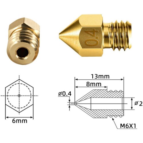 نازل برنجی 0.4 پرینتر سه بعدی برای انواع فیلامنت از جمله PLA ، ABS ، PETG ، چوب و ترکیبات لاستیکی قابل استفاده است. ابعاد دقیق آن برابر با 13x6x6 میلی متر بوده و طراحی دقیق آن باعث می شود فشار یکنواختی بر فیلامنت اعمال گردد و جریان خروجی کاملا ثابت باقی بماند. این ویژگی موجب بهبود جزئیات در چاپ های پیچیده و طرح های مهندسی می شود.