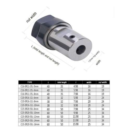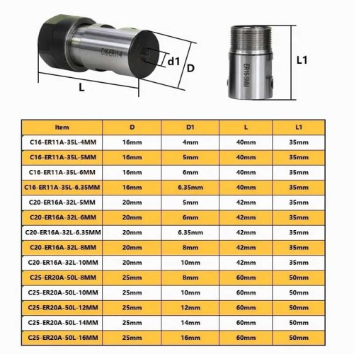 - امکان استفاده از ابزارهای با قطر کوچک و متوسط: کولت ER11-A ابزارهایی با قطر 0.5 تا 7 میلی متر را پشتیبانی می کند، بنابراین برای فرزکاری دقیق و سوراخ کاری مناسب است.