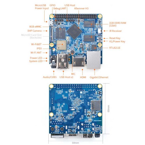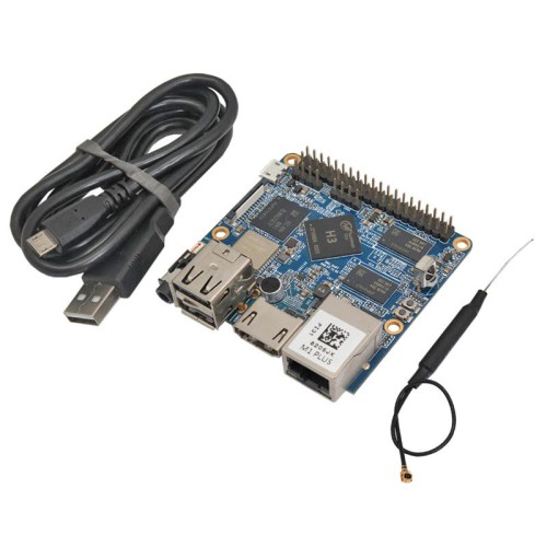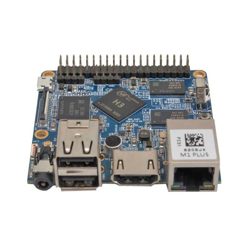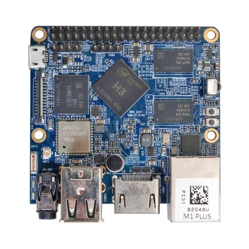 The NanoPi M1 Plus uses the Allwinner H3 Soc. It integrates Gbps Ethernet, IR receiver, video/audio output, Wi-Fi & Bluetooth, onboard microphone and supports DVP/Camera/HDMI and CVBS. It has a serial debug port. Its GPIO pins are compatible with those of a Raspberry Pi.