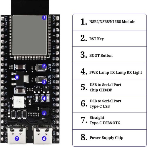 This development board uses PCB internal antenna and has two processing cores, each of which can be controlled separately, with a frequency between 80MHz and 240MHz, also equipped with ESP32-S3 series chips, 16MB flash and 8 It is also PSRAM.
