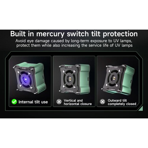 این دستگاه به سنسور هوشمند تشخیص زاویه مجهز است که به همراه سیستم ایمنی داخلی، از روشن ماندن ناخواسته لامپ UV جلوگیری کرده و نقش مهمی در محافظت از چشم تعمیرکار و افزایش طول عمر لامپ UV ایفا می کند. سیستم کاهش دما در 3 ثانیه (3S Cooling) عملکرد سریع و موثر دستگاه را تضمین می کند. فن مکنده و لامپ یو وی مدل XZZ دارای باتری داخلی 960 میلی آمپر ساعت بوده و از طریق درگاه Type C شارژ می شود که امکان استفاده کاملا بی سیم را فراهم کرده و آزادی عمل بیشتری در محیط های تعمیراتی ایجاد می کند.