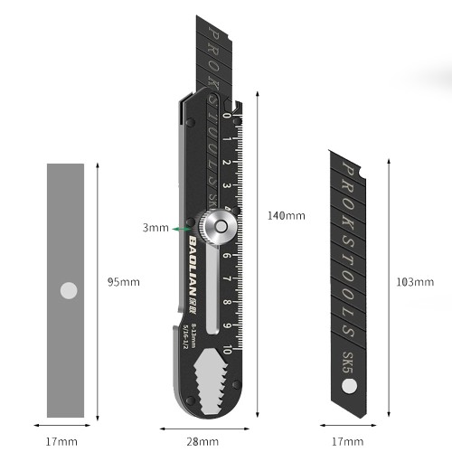 ابعاد بدنه کاتر : 140x28x3 میلی متر و وزن آن 100 گرم است. طراحی ارگونومیک باعث استفاده راحت و بدون خستگی حتی در طولانی مدت می شود. طراحی جمع و جور امکان حمل آسان و نگهداری در جیب یا جعبه ابزار را فراهم می کند و استفاده از آن در محیط های صنعتی و خانگی بسیار راحت است.