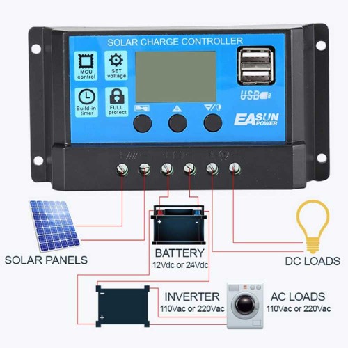 نصب و راه اندازی این دستگاه بسیار ساده است. ابتدا باتری به کنترلر وصل می شود و دستگاه به صورت خودکار ولتاژ آن را تشخیص می دهد. سپس پنل خورشیدی به ورودی دستگاه متصل می شود و در نهایت مصرف کننده ها به خروجی کنترلر وصل می شوند. شارژر پنل خورشیدی 12 و 24 ولت این امکان را می دهد که باتری ها در محیط های مختلف به راحتی شارژ شوند. طراحی جمع و جور با ابعاد 133x70x34 میلی متر نصب آسان را در هر محیطی ممکن می کند.